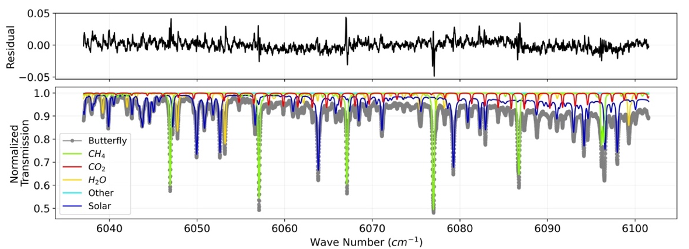 Typical column spectrum observed using a Butterfly spectrometer. Molecular absorptions due to methane, CO2 and water are clearly observed and processed using CalTech’s GGG analysis suite.